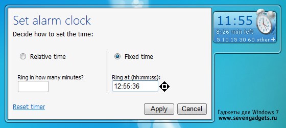 Самый обычный будильник. В настройках можно задать конкретное время или через сколько минут прозвонить. На лицевой панели выводиться текущее время и сколько осталось до звонка будильника. Поимо звукового сигнала в настройках можно установить вывод текстовго оповещения.
