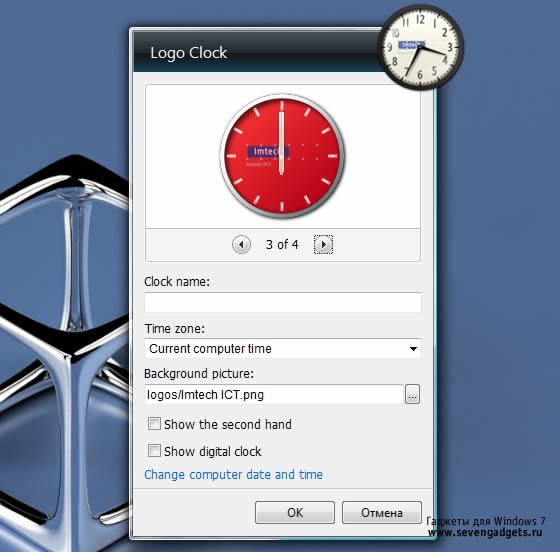 Часы для рабочего стола Windows, отличающиеся возможностью установить в фоне собственный логотип. Гаджет позволяет присвоить часам имя, выбрать необходимый часовой пояс, включить секундную стрелку и дополнительную цифровую индикацию времени. Имеется поддержка скинов.