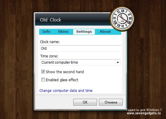 Стандартные стрелочные часы с несколькими вариантами циферблата, выполненные в "старом" стиле. В настройках можно изменить подпись, включить эффект стекла и отключить отображение секундной стрелки.