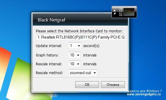 Простенький индикатор сетевой активности (входящего и исходящего трафика), так же показывает график. Чтобы гаджет заработал, необходимо в настройках выбрать свое сетевое устройство. Так же в настройках можно указать интервал обновления показателей и масштаб графика.