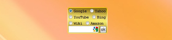Простое поисковое мини-приложение. Осуществляет поиск по Google, Yahoo, YouTube, Bing, Wikipedia и Amazon. Имеет несколько вариантов оформления.
